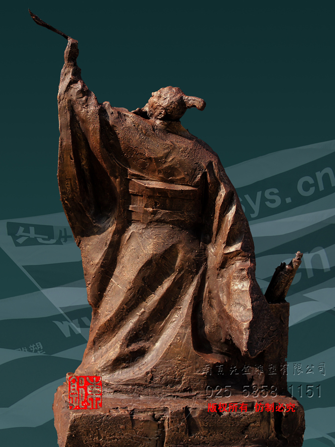 張芝字伯英,出生官宦之家,幼時(shí)高操,勤習(xí)學(xué)書(shū),朝廷賞識(shí),令他做官,而他并非貪圖高官厚祿,甘做布衣。素日臨池學(xué)書(shū),得崔杜之法,復(fù)而變之,遂成“今草”。張芝對(duì)書(shū)藝癡醉令人驚嘆。衛(wèi)恒《四體書(shū)勢(shì)》里有言“凡家之衣帛,必先書(shū)而后練之。臨池學(xué)書(shū),池水盡墨。”張芝對(duì)于書(shū)法藝術(shù)的不斷索求,終成一代“草圣”,當(dāng)是“為世所寶,寸紙不遺”。雕塑里張芝如平日習(xí)作,但見(jiàn)他揚(yáng)手,握管,在虛空中縱姿揮毫,一如其書(shū)法,一筆而就,不拖沓凝滯,衣袍素袖宛如字之體勢(shì)婉轉(zhuǎn)流暢,舒箋觀(guān)鳥(niǎo)跡,研墨染魚(yú)緇。